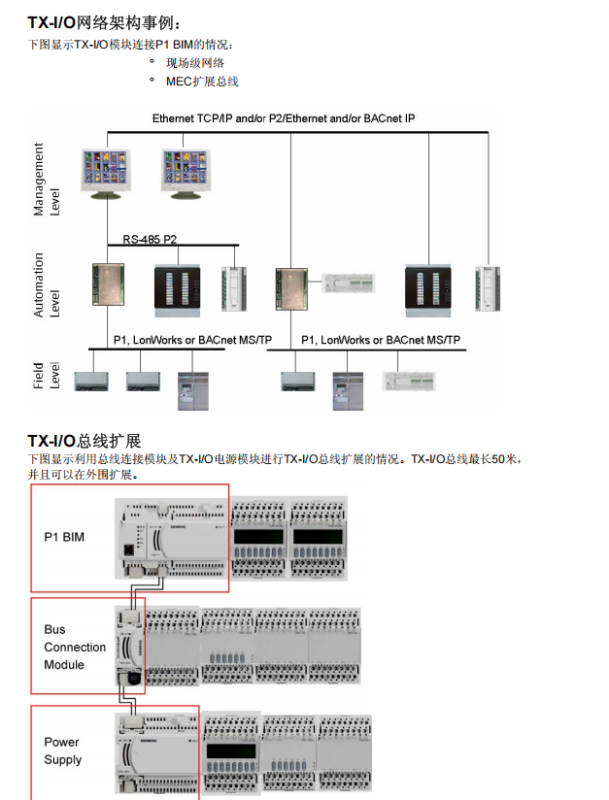 TX-I/O总线同时传送电及通讯信号,最大可以扩展到50米。热插拔的电子组件允许在没有除去末端导线或者扰乱总线的情况下拆开甚至替换带电器件。